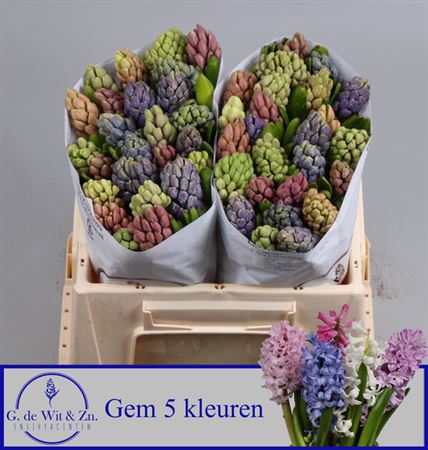 Colli 5 Longueur min de la tige 30 cm Contenu 50 Nombre minimum de fleurs par bulbe/tige 38 Fust 566 Stade de maturité 2-2 Nombre 250 Couleur de la fleur couleurs diverses Origine NL Qualité A1 Producteur G. de Wit en Zn. -,--≥ 50 pcs -,--Jacinthes Variés 5 Couleurs
