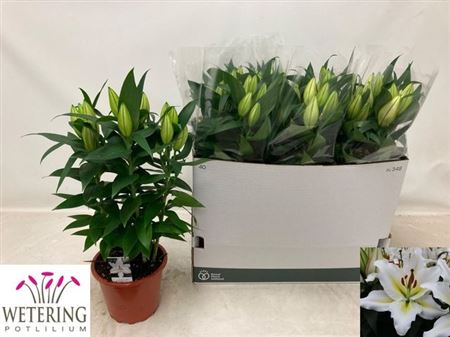 Colli 2 Taille du pot 19 Cm Contenu 5 Hauteur minimum de la plante 54 Cm Fust 348 Stade de maturité 3-3 Nombre 10 Origine NL Nombre de pieds/plantes 33 Qualité A1 Producteur Wetering Potlilium BV  -,--≥ 5 pcs  -,--Lys Oriental Blanc